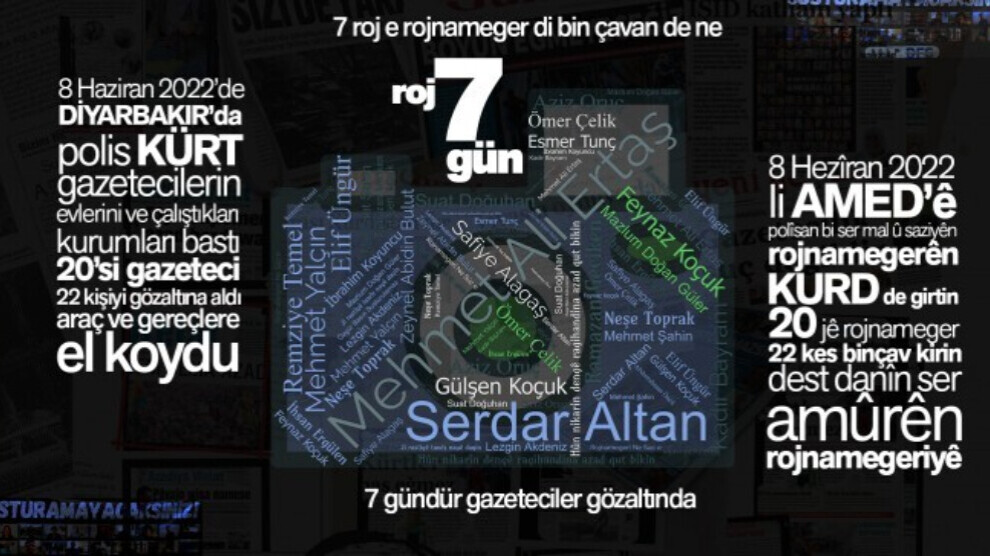 وأكد البيان أنه "تم اعتقال 22 شخصاً، بينهم 20 صحفياً، خلال مداهمات المنازل وأماكن العمل في الثامن من حزيران الجاري، واحتجزوا في فرع شرطة آمد منذ سبعة أيام"، مشيراً إلى أن "لم يعرف لماذا اعتقل الصحفيين، وما يمكن فهمه من المعلومات التي قدمتها الشرطة، فإن زملائنا محتجزين حالياً بسبب أنشطتهم الصحفية فقط".