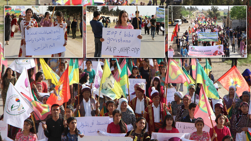 الشهباء ـ أكدت المشاركات في تظاهرة مقاطعة الشهباء في شمال وشرق سوريا أن قوات الدفاع الشعبي تحارب للوصول إلى حرية الشعوب وإلى حرية الشعب الكردي ووحدة الأراضي الكردستانية، ولا يحق لأي قوة أو دولة أن تشن هجماتها وحربها عليها.