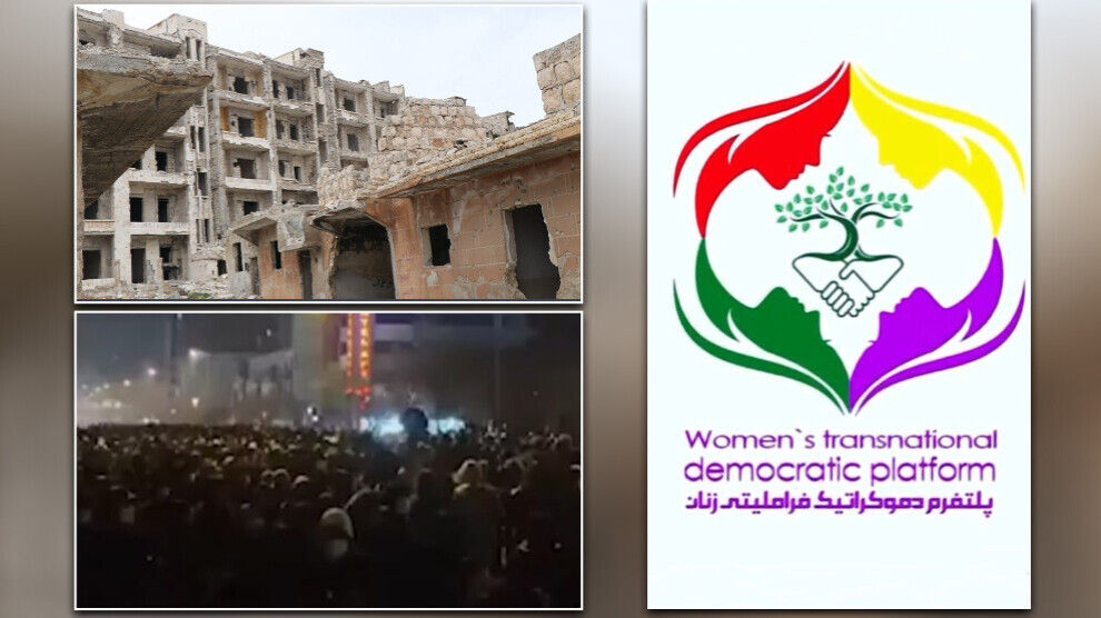 أطلقت المنصة الديمقراطية العابرة للحدود للنساء حملة لدعم الاحتجاجات المستمرة في إيران والحكم الذاتي في روج آفا، مؤكدةً أن التضامن النسوي العابر للحدود ضرورة تاريخية لمواجهة القمع والحروب في المنطقة.