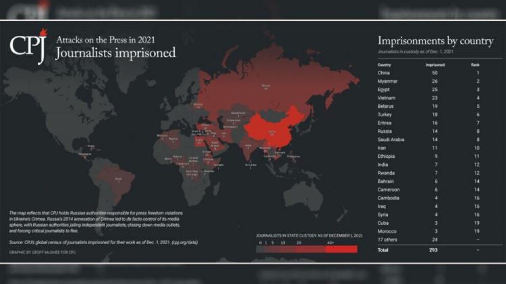 في تقريرها السنوي لعام 2021، الذي صدر أمس الأربعاء 8 كانون الأول/ديسمبر، قالت لجنة حماية الصحافيين الدولية، أن عدد الصحفيين السجناء في العالم بلغ مستواً قياسياً بوصوله إلى 293 صحفياً سجيناً، وهو ما يزيد عن عددهم في عام 2020 الذي بلغ 280 صحفياً سجيناً.