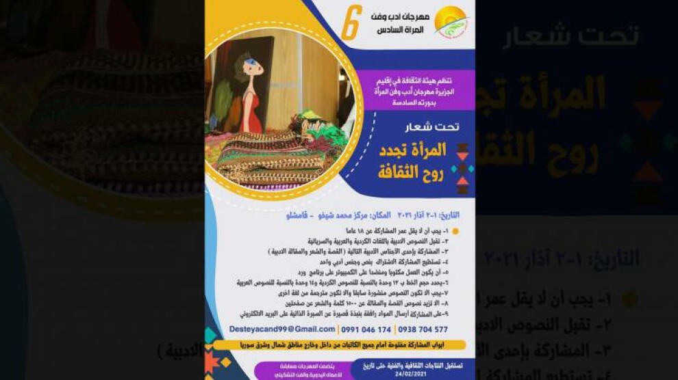 برعاية هيئة الثقافة والفن في شمال وشرق سوريا وبالتعاون مع رابطة المرأة المثقفة ستقام النسخة السادسة من مهرجان فن وأدب المرأة في مركز محمد شيخو في مدينة قامشلو بإقليم الجزيرة