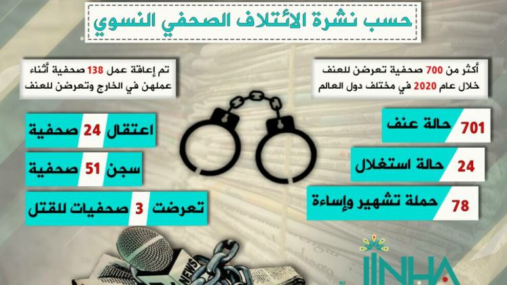 في نشرته الصادرة بتاريخ 10 كانون الأول/ديسمبر، بمناسبة يوم حقوق الإنسان، ذكر الائتلاف الصحفي النسوي، إن أكثر من 700 صحفية تعرضن للعنف خلال عام 2020 في مختلف دول العالم. وكشف الائتلاف عن 701 حالة عنف خلال العالم 2020 فقط. كما أشار إلى 24 حالة استغلال، و78 حملة تشهير وإساءة. كما تم إعاقة عمل 138 صحفية أثناء عملهن في الخارج، وتعرضن للعنف. فيما اعتقلت 97 صحفية، وحكم بالسجن على 51 صحفية، فيما تعرضت ثلاث صحفيات للقتل.