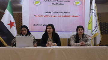 ضمن ندوة حوارية أقيمت في مدينة قامشلو بإقليم شمال وشرق سوريا، ناقشت سياسيات وعضوات مكتب المرأة في مجلس سوريا الديمقراطي موضوع العدالة الانتقالية وآلية تطبيقها في سوريا.