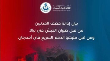 شجب بيان اللجنة التمهيدية لنقابة أطباء السودان استهداف المدنيين العزل ومستشفى العيون في مدينة نيالا غرب السودان، مؤكداً أن تلك الاستهدافات انتهاك لكل القوانين الدولية والأعراف الإنسانية.
