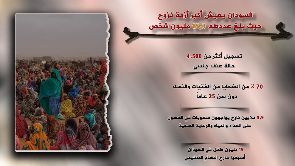 وبحسب تقرير المفوضية السامية لشؤون اللاجئين فالسودان يعيش أكبر أزمة نزوح على مستوى العالم حيث بلغ عددهم 15.3 مليون شخص، 9.3 مليون نازح داخلياً، 4.9 مليون لاجئ وطالب لجوء وعائد.