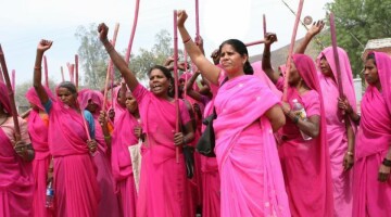 هزاران زن با ساریهای صورتی و چوب دستیهایشان علیە خشونت کار میکنند، خواهان حقوق خود میشوند.