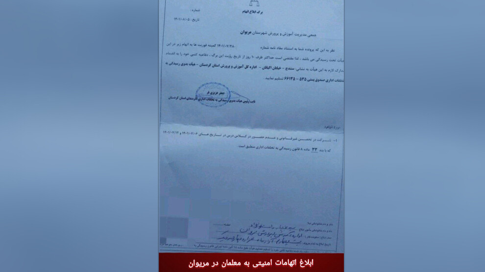 بنابر اخبار منتشر شده، آموزش و پرورش مریوان تعدادی از معلمان این شهر را به بهانهی «شرکت در تحصن، اعتصاب و تظاهرات غیرقانونی»، «اعمال فشار گروهی برای تحصیل مقاصد غیرقانونی» و«تحریک اعتصاب و تظاهرات غیرقانونی» متهم کرده است.