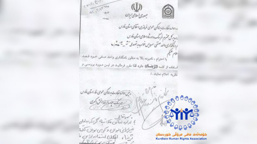 مرکز خبر- امروز یکشنبه ٩ بهمن‌ماه ١۴٠١، جمعیت حقوق بشر کوردستان یک سند که در آن «اداره نظارت بر اماکن عمومی فرماندهی انتظامی استان فارس» از «مدیرکل فرهنگ و ارشاد اسلامی استان فارس» استعلام نامگذاری یک واحد صنفی را با نام «ژینا» کرده بود به دلیل «غیر ایرانی بودن و کوردی بودن» این نامگذاری ممنوع اعلام شده است.