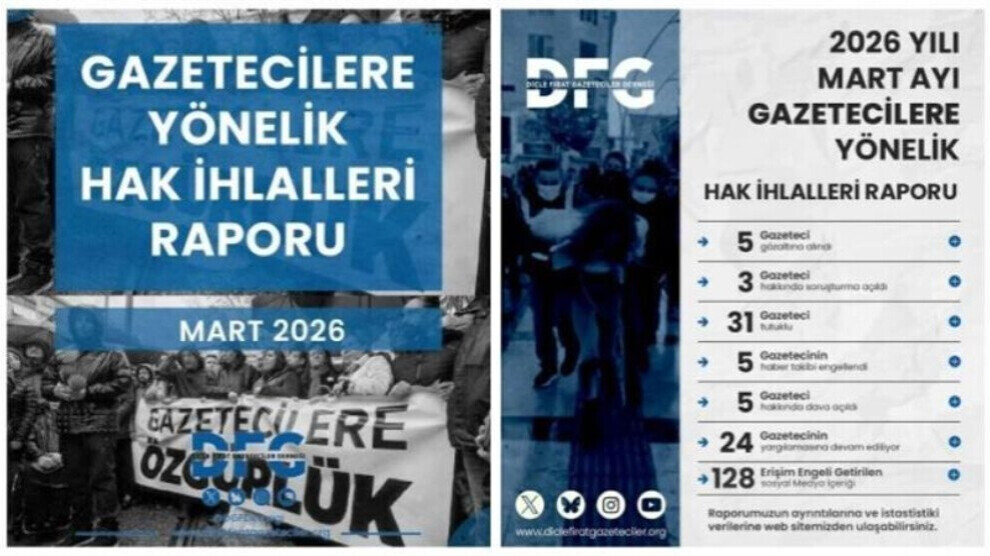 گزارش جدید «انجمن روزنامهنگاران دجله و فرات» نشان میدهد در ماه مارس، ۵ خبرنگار بازداشت، ۲ نفر زندانی و ۵۳ حساب و ۷۵ محتوای رسانهای مسدود شدهاند؛ آماری که از تشدید محدودیتها علیه آزادی رسانهها در ترکیه حکایت دارد.