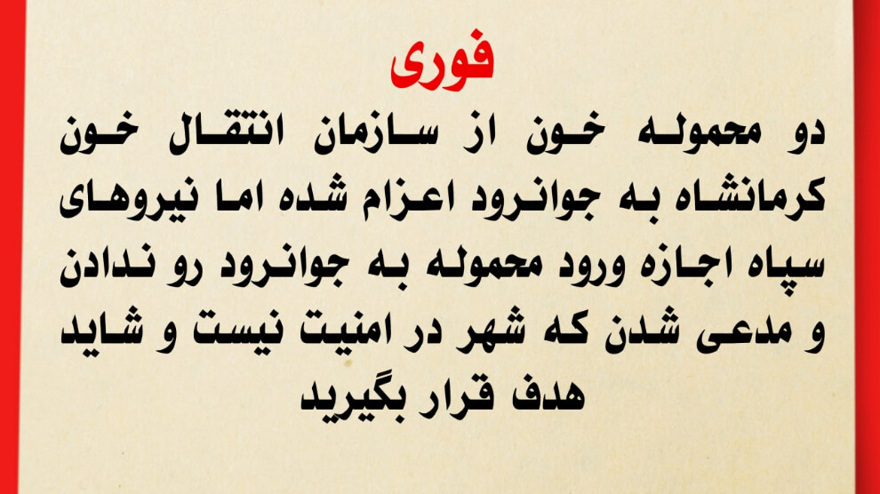 همچنین گزارش‌ها حاکی از آن است دو محمولە خون از سازمان انتقال خون کرماشان بە جوانرو اعزام شدە اما نیروهای سپاە مانع ورود محمولە بە شهر شدە و مدعی شدند کە شهر امنیت ندارد و شاید هدف قرار بگیرد.