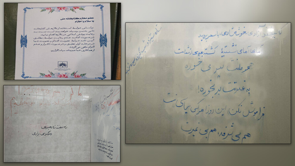 همچنین در بخش‌هایی از کتابخانه اقدام به شعارنویسی کرده و شعارهای ضدحکومتی و آزادی‌خواهانه نوشتند.