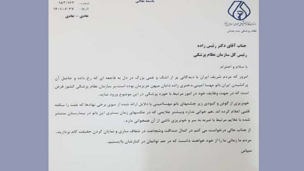 رئيس شورای هماهنگی نظام پزشکی استان هرمزگان در نامهای به رئیس نظام پزشکی ایران دربارهی ضرورت رسيدگی و شفافسازی علت مرگ ژینا امینی نوشتە است« خونريزی از گوش و كبودی زير چشم با سكته همخوانی ندارد.»
