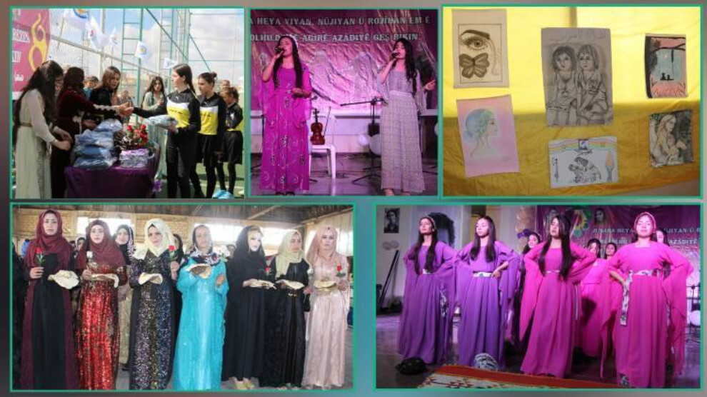 بە مناسبت هشت مارس پلتفرم فعالیتهای مشترک زنان قامشلو-شمال و شرق سوریە ضمن بازدید از نهادهای مختلف زنان هدایای بە آنها اهدا کرد. در حلب نیز کمیتهی آموزش جامعەی دموکراتیک KPC-D نمایشگاه نقاشی برگزار کرد. جشنی برای کارگران زن نانواییهای در شهر حسکه برگزار شد. در کوبانی نیز زنان ورزشکار این روز را با فعالیتهای ورزشی جشن گرفتند و در شهبا هنرمندان هنرهای خود را ارائه کردند.