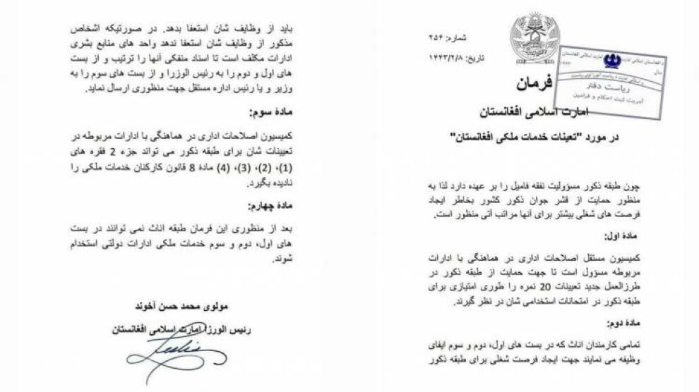 «تمامی کارمندان زن که در مقامهای ریاست، معاونیت و مدیریت ایفای وظیفه مینمایند جهت ایجاد فرصت شغلی برای مردان باید از وظایفشان استعفا بدهند در صورتی که اشخاص مذکور از وظایفشان استعفا ندهند واحدهای منابع بشری ادارات مکلف است تا اسناد برکناری آنان را ترتیب و از مقامهای ریاست و معاونیت را به رئیس الوزرا (محمد حسن آخند که تا کلاس پنجم درس خوانده) و از مقامهای مدیریت به وزیر و یا رئیس اداره مستقل جهت منظوری ارسال نمایند.