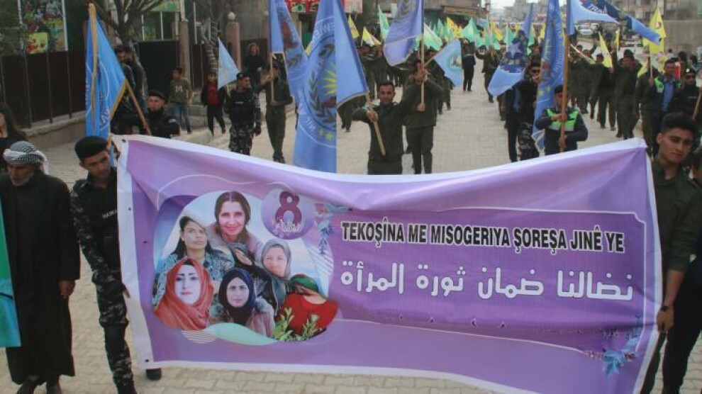 بە مناسبت ٨ مارس و در حمایت از زنان، مردان کوبانی با شعار " مبارزەی ما تضمین کنندەی انقلاب زنان است"، راهپیمایی کردند.
