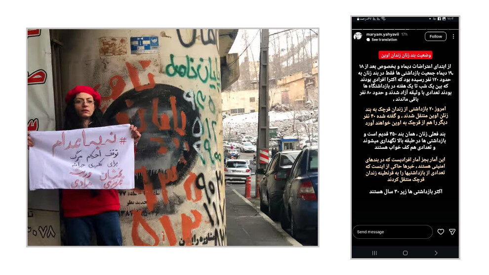 مریم یحیوی در استوری خود گفت: از ابتدای اعتراضات دی‌ماه و بخصوص بعد از ۱۸ تا ۱۹ دی‌ماه جمعیت بازداشتی‌ها فقط در بند زنان به حدود ۱۲۰ نفر رسیده بود که اکثرا افرادی بودند که بین یک شب تا یک هفته در بازداشتگاه‌ها بودند و تعدادی با وثیقه آزاد شدند و حدود ۸۰ نفر باقی ماندند.