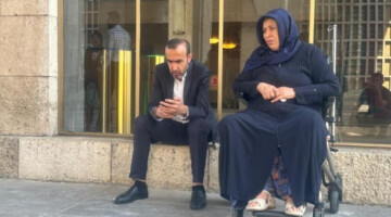 اَمینه شنیاشار روی ویلچر مقابل پارلمان، منتظر اجرای عدالت است