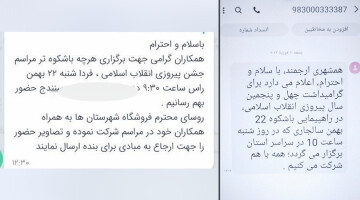 پیامکهایی برای تشویق بە مشارکت در مراسم حکومتی ٢٢ بهمن بە مردم ارسال شدە است و کارمندان و دانش آموزان نیز تهدید بە اخراج شدەاند.