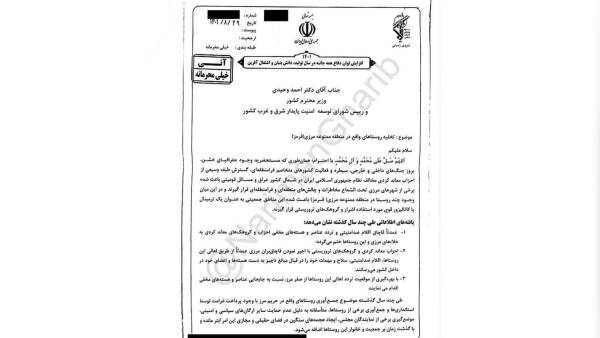 این نامه در تاریخ ۲۹ آبان سال گذشته نوشته شده است و موضوع آن "تخلیه روستاهای واقع در منطقه ممنوعه مرزی" بوده است و مهر آنی و خیلی محرمانه بر آن زده شده است.