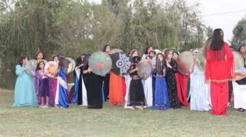 Li navenda Tevgera Hîlala Zêrîn a bajarê Kobanê, bi dehan jinên ciwan û zarok civateke hunerî ya resen rês dikin û çanda jin-dayîkê zindî dikin.