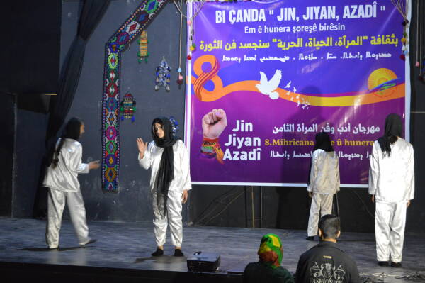 Qamişlo – Îro 8’emîn Mihrîcana Wêje û Hunera Jinê, bi pêşengtiya Desteya Çandê ya Herêma Cizîrê bi dirûşma “Jin Jiyan Azadî” li Navenda Mihemed Şêxo ya Çand û Huner a li bajarê Qamişlo ya Bakur û Rojhilatê Sûriyeyê dest pê kir.