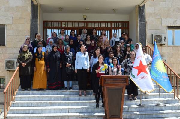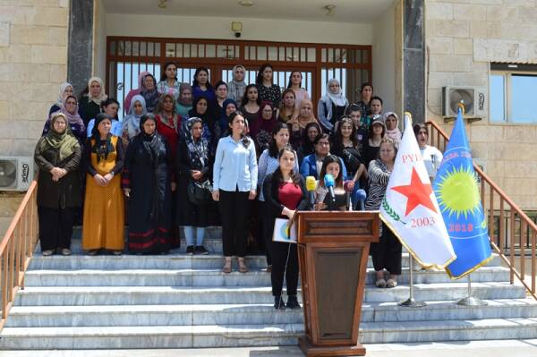 Daxuyanî li pêşiya navenda PYD a bajarê Qamişlo- Bakur û Rojhiltê Sûriye ji aliyê Endama Meclisa Jin a PYD Dîdem Elî ve hate xwendin.