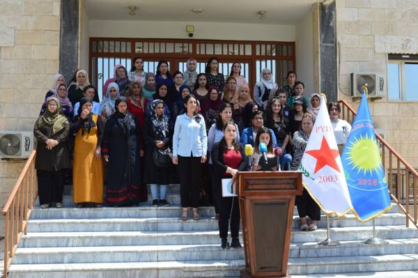Daxuyanî li pêşiya navenda PYD a bajarê Qamişlo- Bakur û Rojhiltê Sûriye ji aliyê Endama Meclisa Jin a PYD Dîdem Elî ve hate xwendin.