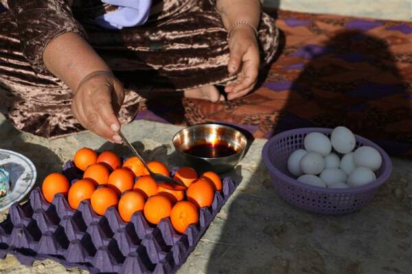 Di Cejna Çarşema Serê Nîsanê de herî zêde rengkirina hêkên kelandî bi nav û deng e. Bi her cûre rengê biharê ku sor e, kesk e, zer e, narinci ye hêk tên xemilandin û her kesek ji bo xwestek û daxwaza xwe van rengan hildibijêre. Dayê Nafiye bahsa cejnên berê ku çawa hêkan reng dikirin jî kir û got: “Pir ne berê ye jî, tê bîra min rahmetiya dayikamin qalikê pîvazan dianî, dixiste nav beroşekê, dema hêk jî dixistin nav wan qalikan piştî demekê rengê hêkan sor dibûn. Dîsa giya û kulîlk dianîn di nav hêkan de dikelandin. Hêk rengê wan giya û kulîlkan digirt. Dîsa hêk bi çayê re dikelandin, rengê wan hêkan sor sor dibû. Niha hinek rengên sinaî bikartînin, lê belê rengên xwezayî gelekî çêtir in. Li gor dilê min divê em vegerin cejnên xwe yên berê, ji ber hîn xweştir bûn.”