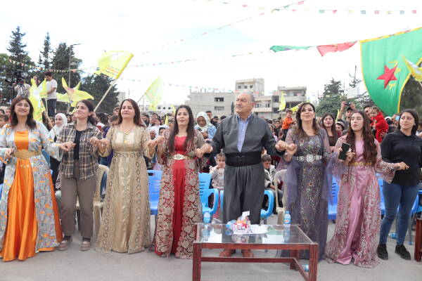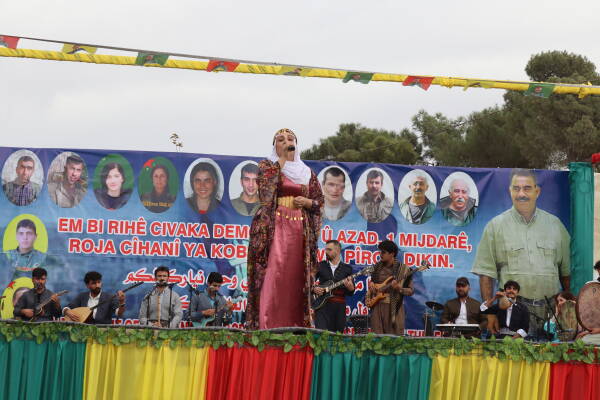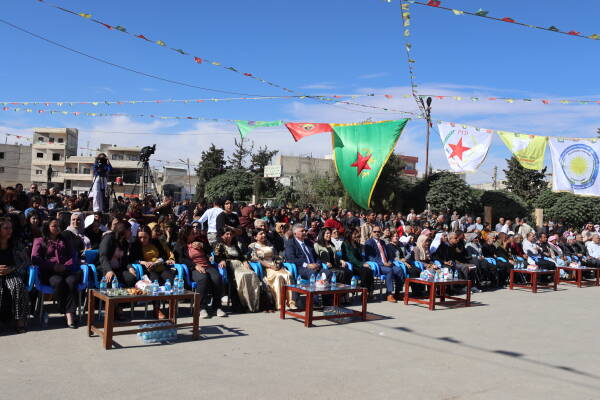 Pîrozbahiya ku li qada şehîd Egîd pêk hat, bi temamî bi posterên rêberê gelê Kurd Abdullah Ocalan, alên YPJ, QSD, Kongra Star, Rêveberiya Xweser û ya Sûriyê hatibû xemiland.