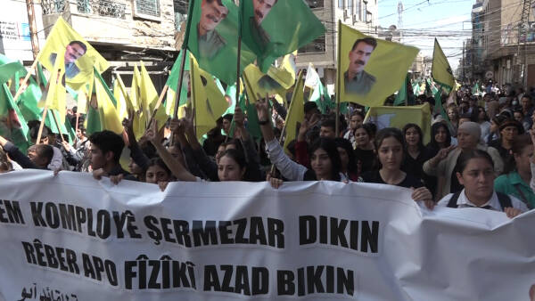 Meşa ku li qada Jina Azad destpê kir, posterên Ocalan, alên QSD’ê, her wiha pankratên bi nivîsên “Bi avakirina jiyaneke aştiyane û demokratîk, em ê komployê têk bibin” û “Em komploya navdewletî şermezar dikin û azadiya fîzîkî ya Rêber Apo daxwaz dikin” hatibûn hilgirtin.