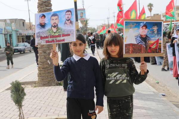 Di meşê de gel alên Hêzên Parastina Êzidxanê û posterên her sê fermandarên Şengalê bilind kirin û bi dirûşmên şehîd rûmeta me ne bimre îxanet berz kirin. Di dawiya meşê de li ser navê Rêveberiya Xweser a Şengalê û tevahî gel û saziyên wê endamê heyeta eşîran Nayif Şemo daxuyanî da.