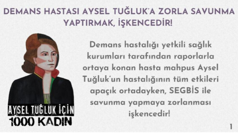 Navenda Nûçeyan - Koma kampanyaya 1000 Jin Ji Bo Aysel Tûglûkê bi daxuyaniyekê li hemberî neçarkirina bi zorê ya girtiya siyasî Aysel Tûglûk a ku di raporên saziyên tenduristiyê yên rayedar de derketiye holê ku bi nexweşiya demansê ketiye, ku di Doza Kobanê de bi Pergala Agahdariyê ya bi Deng û Dîmen (SEGBÎS) ve parastin bike, bertek nîşan da û got: “Sûcê mirovahiyê ye.”