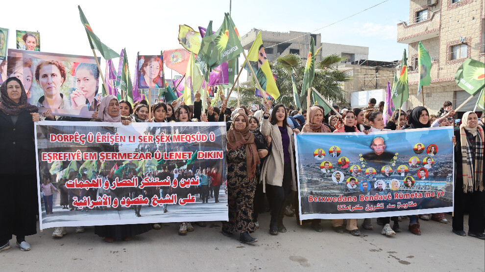 Di meşê de bi sedan jinên kantonê, gel û ciwanên wê, di heman demê desteyên Rêveberiya Xweser, saziyên civaka sivîl, partiyên siyasî, malbatên şehîdan û xwendekar amedebûn. meşevanan pankartên bi nivîsên “hedefgirtina jinên pêşeng şoreşa me ranawestîne têkoşîna me bilindtir dike”, “Berxwedana Bendavê rûmeta me ye” û “na ji êrşên hikûmeta Şamê li ser sivîlan li  taxên Şêx Meqsûd û Eşrefiyê”, di heman demê de wêneyên şoreşgerên komkujiyên Parîsê, posterên rêberê gelê Kurd Abdullah Ocalan hatin hilgirtin.