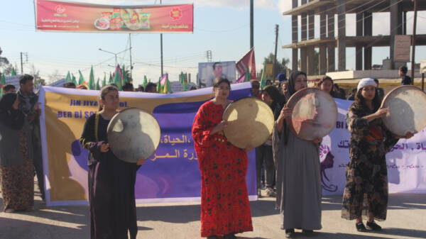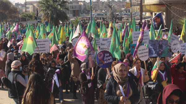 Meşvan alên Kongra Star, wêneyên Rêberê Gelê Kurd Abdulah Ocalan û pankartên bi nivîsa "Na ji qetilkirina jinan re", “Jin Jiyane" û " bi tekoşîna domdar emê bighêjin azadiya Rêber Ocalan" hilgirtin.