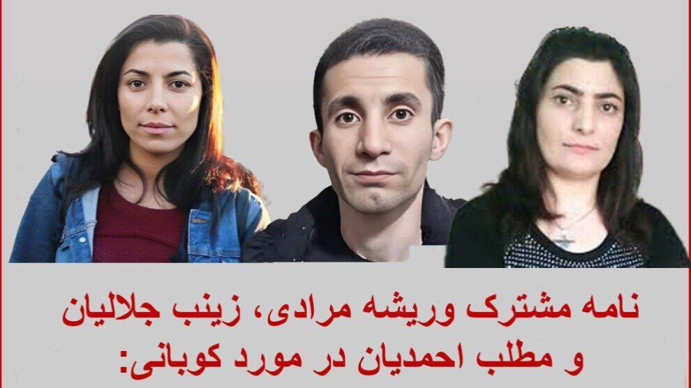 Navenda Nûçeyan- Sê girtiyên siyasî Zeyneb Celaliyan, Werîşe Muradî û Metleb Ahmediyan ku li girtîgehên rejîma Îranê tên girtin, bi armanca piştevaniya berxwedana Kobanê nameyek hevpar nivîsandin. Di nameyê de bang li hemû azadîxwaz û ciwanên Îranê hat kirin ku piştgiriyê bidin berxwedana Rojava.