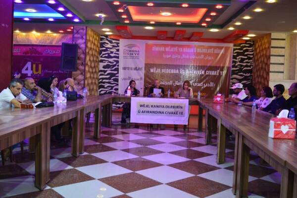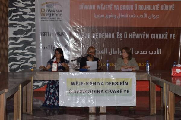 Qamişlo - Hefteya Wêjeyî ya ku ji aliyê Dîwana Wêjeyê ya Bakur û Rojhilatê Sûriyê ve bi dirûşmeya “Wêje Vedenga Êş û Hêviyên Civakê ye” yekemîn car li Rojavayê Kurdistanê tê lidarxistin û ji 28’ê Gulanê ve hatiye destpêkirin, di roja xwe ya 4’emîn de berdewam dike. Heya niha di navbera 4 rojan de bernameyekî dewlemend ji aliyê jinên helbestvan û wêjevan ve tê pêşkêşkirin, der barê de gelek çîrok, helbest, panêl û semîner li ser girîngiya wêjeya jin hatine dayîn. Bernameya roja 4’emîn semînera der barê “Wêjeya jinê di navbera navlêkirin û jîwariyê de” de bû. Gotûbêjên vê semînerê Hena Dawûd, Evîn Yûsiv û Evêsta Ibrahîm e. Piştî pêşkêşkirina vê mijarê beşdarvana nîqaşên fireh kirin. Bi dawîbûna semînerê re çîrokên ku bi pênûsa jinan hatine nivîsandin ji beşdarvana re hatin vegotin. Têkildarî naveroka vê semînerê Rojnamevan û Nivîskara jin Evîn Yûsif naveroka vê semînerê ji me re parve kir.