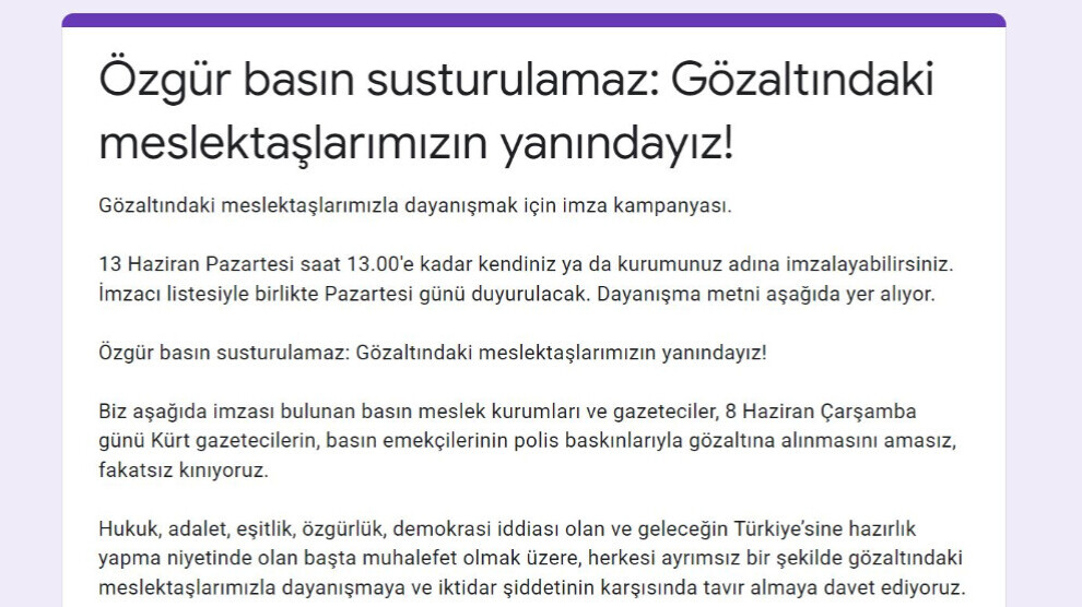 Navenda Nûçeyan – Ji bo 20 jê rojnameger 21 kesên ku di 8'ê hezîranê de li Amedê bi serdegirtina malan û cihên karê xwe de hatin binçavkirin kampanyaya îmzeyê hat destpê kirin. Dê kampanya ku ji aliyê komeke rojnameger ve bi ser navê "Çapemeniya azad nayê bêdengkirin, em li cem hempîşeyên xwe ne ku di binçavan de tên ragirtin" hat destpêkirin, wê heta 13'ê Hezîranê saet 13.00'an bidome. Lîsteya îmzekaran dê roja duşemê bê ragihandin.