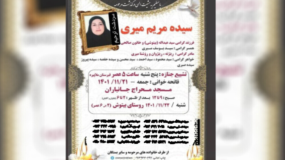 Serdeşt – Maryam Miri ya 35 salî û xwedî sê zarokan ya li gundê Bitosh ya bajarê Serdeşta Îranê, dema ku zaroka xwe ya çarem bi rêya sezaryanê anî dinê jiyana xwe ji dest da. Malbata Maryam Miri idea kirin ku keça wan ya roja pêncşemê li nexweşxaneya Serdeşte di bin çavderiya jinekolog K.A hat sezaryankirin ji ber îhmalê jiyana xwe ji dest daye.