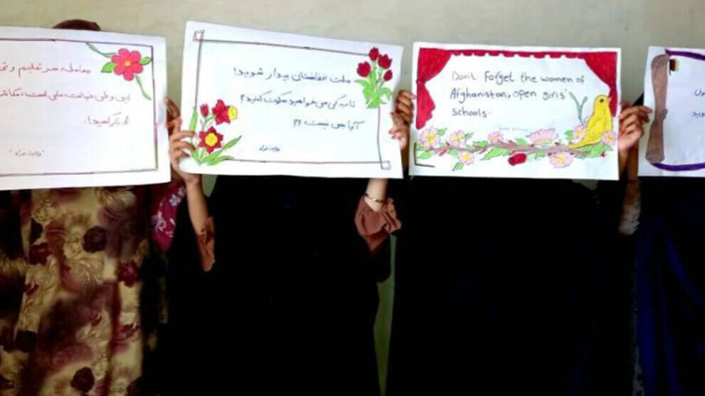 Navenda Nûçeyan –Jinên Efxanistanê li dijî girtina dibistanên jinan a ji aliyê Talîbanê ve xwepêşandan kirin û bi dirûşmeyên nivîskî bêdengiya civaka cîhanî ya li hember girtina dibistanên jinan rexne kirin.