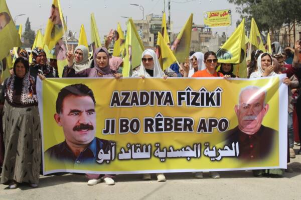 Pêkhateyên Kurd, Ereb, Suryan û Ermen ên li Hesekê di meşa bi dirûşmeya “Dem dema azadiya fîzîkî ya Rêber Apo ye” de destnîşan kirin ku pêdiviya Rojhilata Navîn bi nêrînên Rêberê Gelê Kurd Abdullah Ocalan heye.