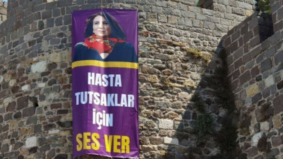 TJA û Meclîsa Jinan a HDP'ê ya Îzmîrê, postera Aysel Tugluk li Kadîfe Kale daliqandin. Di posterê de nivîsa "Deng bibe girtiyên nexweş" cih girt.