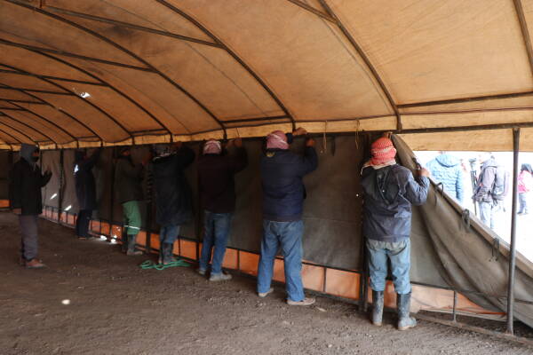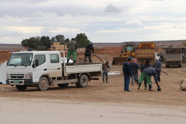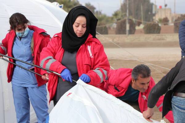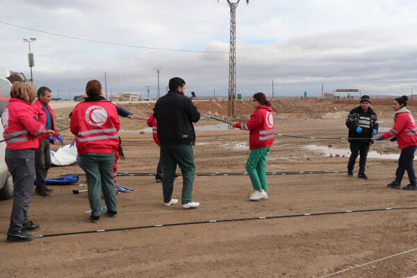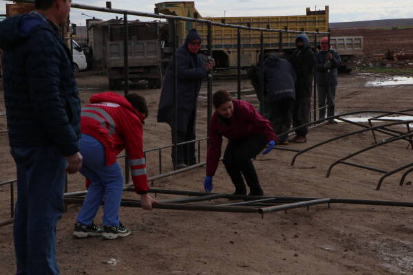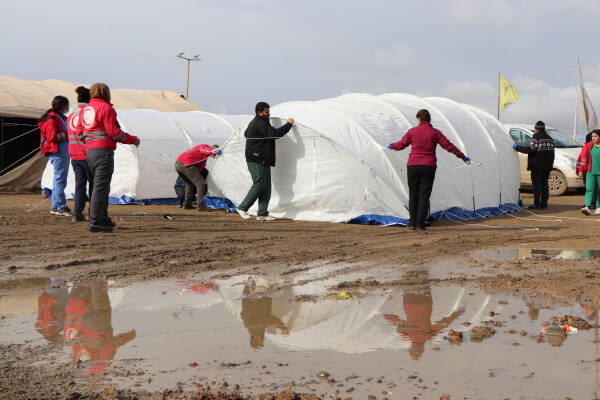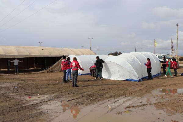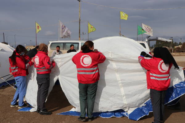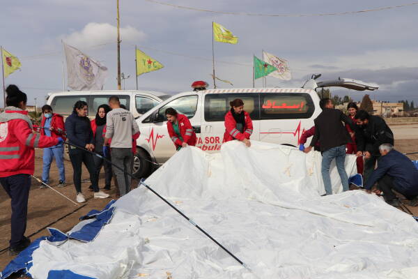 لە ناوچەی تل تەمر لەبەردەم چوارڕیانی شەهید قەندیل کە لەسەر ڕێگای نێودەوڵەتی M4 ە، دەستدەکرێت بە هەڵدانی چادر بۆ پێشوازیکردن لەو کەسانەی کە لە ئەنجامی بوومەلەرزەکە زیانیان بەرکەوتووە.