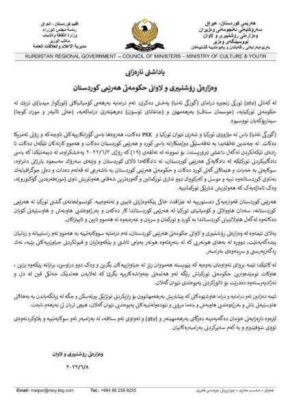 وەزارەتی ڕۆشنبیری لەسەر سوکایەتی بە هەرێمی کوردستان سکاڵا دەگەیەنێتە کەناڵی atvی تورکی