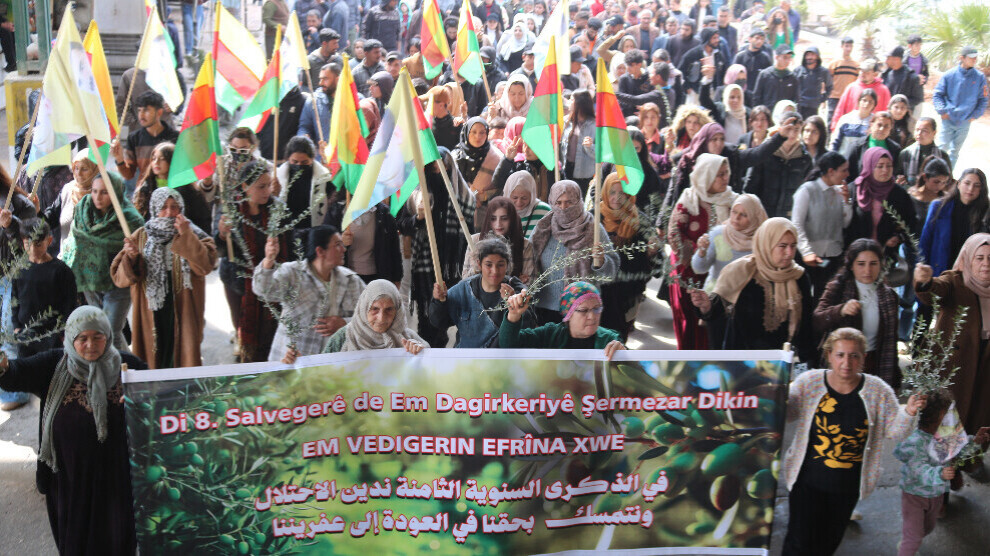 بە دروشمی "داگیرکاری شەرمەزار دەکەین، دەگەڕێینەوە عەفرین"، سەدان کەس لە دانیشتووانی کۆبانێ و کۆچبەرانی عەفرین خۆپیشاندانێکیان ئەنجامدا و ئیرادەی خۆیان بۆ ئاوەدانکردنەوەی ناوچەکەیان و وەرگرتنەوەی ماڵ و حاڵی خۆیان دووپاتکردەوە.