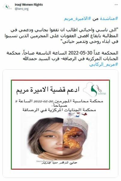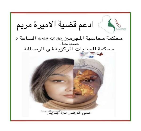 ئەمڕۆ ٣٠ی ئایار لە دادگای تاوانەکانی رەسافە لە شاری بەغدا، دادگاییکردنی تاوانباران بەڕێوەدەچێت و مریەم ئەلرەکابی داوای کردووە کە پاڵپشتی بن و دەڵێت: "بۆ هاوڕێ و خۆشەویستانم، داوادەکەم پاڵپشتم بن و پشتیوانیم بکەن بۆ داواکردنی سزا بۆ ئەو تاوانبارانەی هۆکاری ئازاردانی ڕۆح و وێرانکردنی ژیانم بوون".