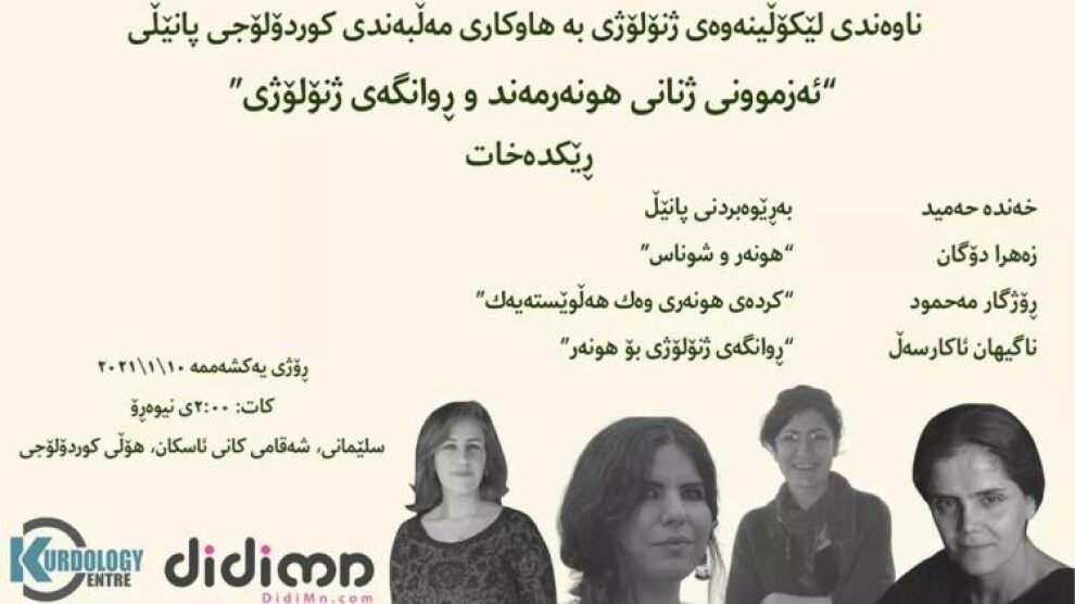 ناوەندی لێکۆڵینەوەی ژنۆلۆژی بە هاوکاری مەڵبەندی کوردۆلۆڤی پانێڵێک لە بارەی ئەزموونی ژنانی هونەرمەند و ڕوانگەی ژنۆلۆژی بۆ ژمارەیەک ژنە هونەرمەند و لێکۆڵەر ڕێکدەخات، پانێڵەکە ڕۆژی یەکشەممە ١٠ی کانوونی دووەمی ٢٠٢١ کاتژمێر ٠٢:٠٠ی دوانیوەڕۆ لە هۆڵی مەڵبەندی کوردۆلۆجی لە شاری سلێمانی بەڕێوەدەچێت.