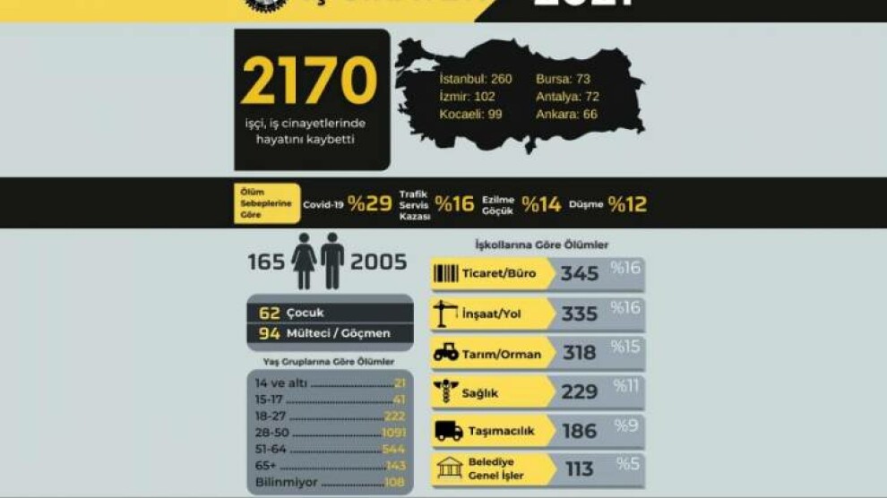 Yaşanan cinayetlerden bin 864 işçi ücretli işçi, 306 işçi de ise kendi işinde çalışan işçilerden oluştu. Pandemi nedeniyle 625 işçi, trafik nedeniyle 342 işçi, göçük nedeniyle 269 işçi yanı sıra diğer işçilerin yüksekten düşme, kalp krizi, beyin kanaması, intihar, zehirleme, boğulma, elektrik çarpması gibi nedenlerle yaşamını yitirdiği paylaşıldı. Raporda, yaşamını yitiren işçilerden 165'nin kadın olarak kayıtlara geçerken 2 bin 5'i ise erkekti.