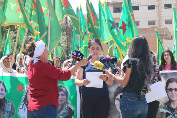 Qamişlo - Kadın Devrimi Forumu’nda katılımcı olan ve forum çıkışı Türkiye tarafından katledilen YPJ ve QSD komutanları Jiyan Tolhildan, Roj Xabûr ile Barîn Botan için 56 kadın kurumu, kuruluşu ve siyasi parti ortak açıklama yaparak katliamı kınadı. Kadınlar Qamişlo’da bulunan Birleşmiş Milletler temsilciliği önünde açıklama yaptı.
