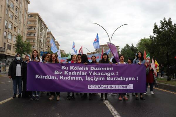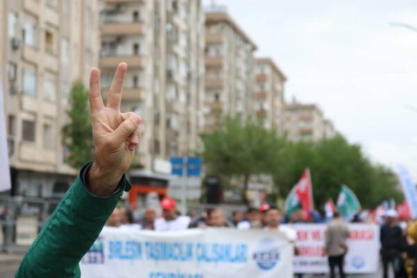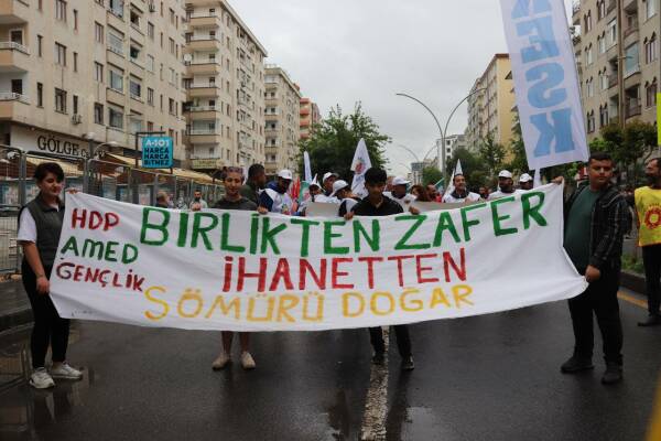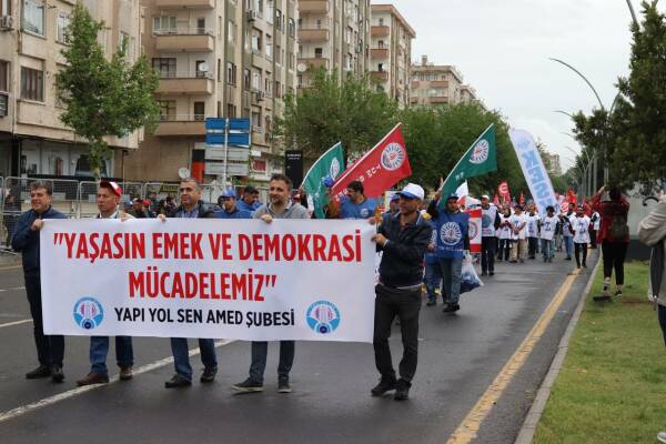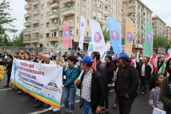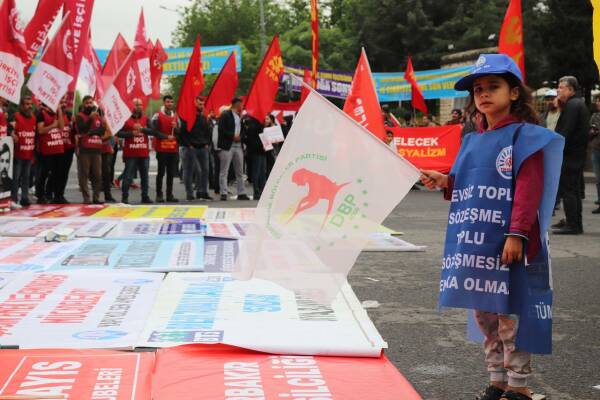 Amed’de binlerce kişi 1 Mayıs mitingi için İstasyon Meydanı’nda bir araya gelerek emek sömürüsü, işsizlik, yoksulluk ve hak gasplarına hep bir ağızdan seslendi.