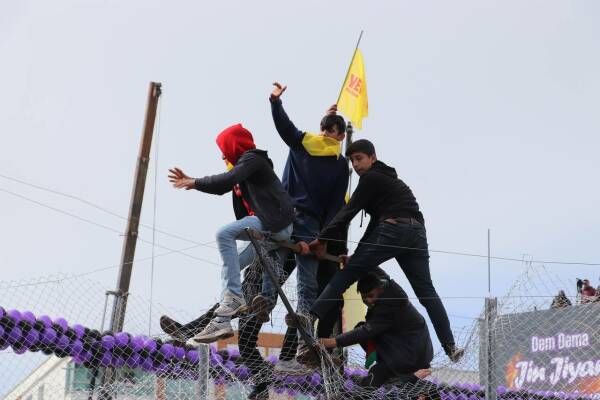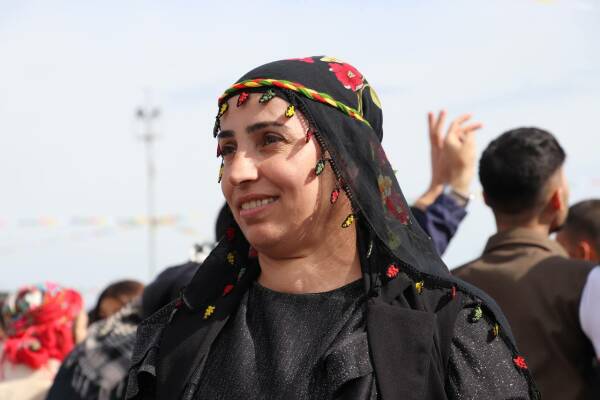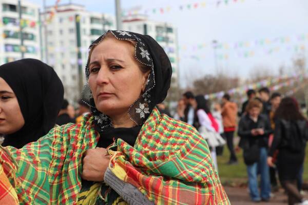 Öte yandan Newroz alanına girişler sırasında gerilimler de yaşanıyor. Alana ulusal kıyafetleri ile girmek isteyen kadınlar engellenmek istense de direnerek alana giriyor. Halkın Newroz meydanına akını devam ediyor.